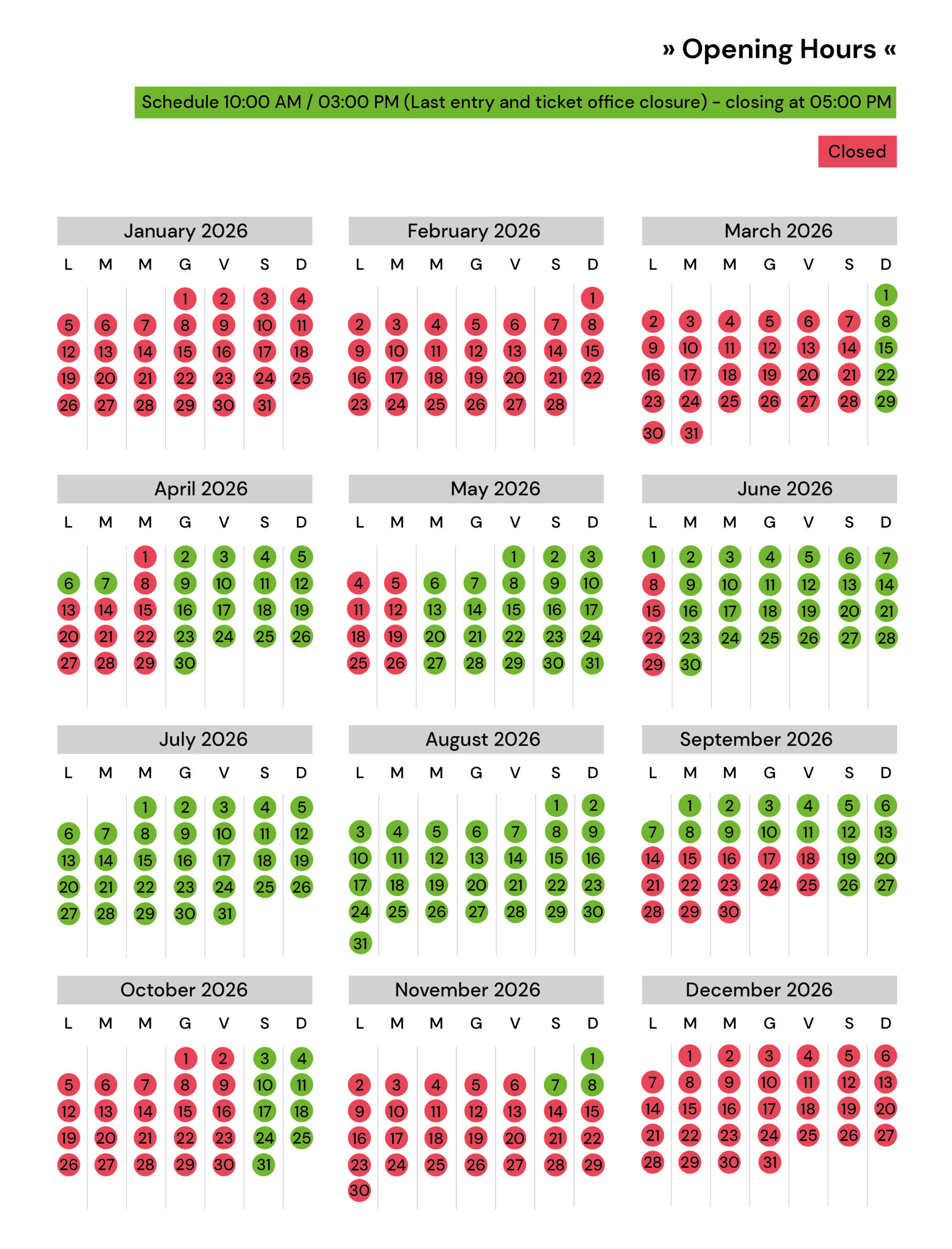 For entrance hours, consult the calendar. Last admission at 3:00 PM.